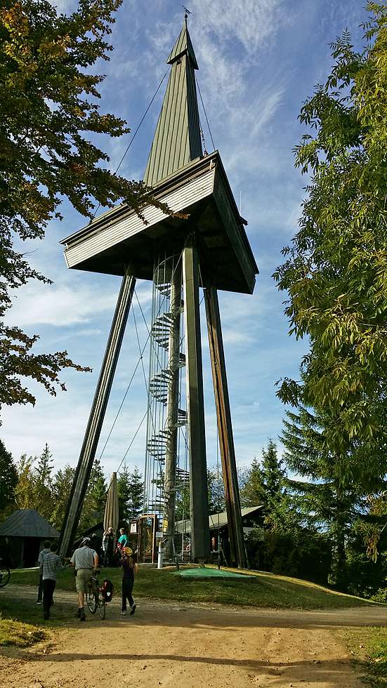 Der auf knapp 1000 Metern Höhe gelegene Turm ist auch dank seines großzügigen Wanderparkplatzes und der Bewirtung während der Sommerzeit der ideale Ausgangs und Ziel-Punkt für große und kleine Mountainbiike-Touren und Wanderungen.