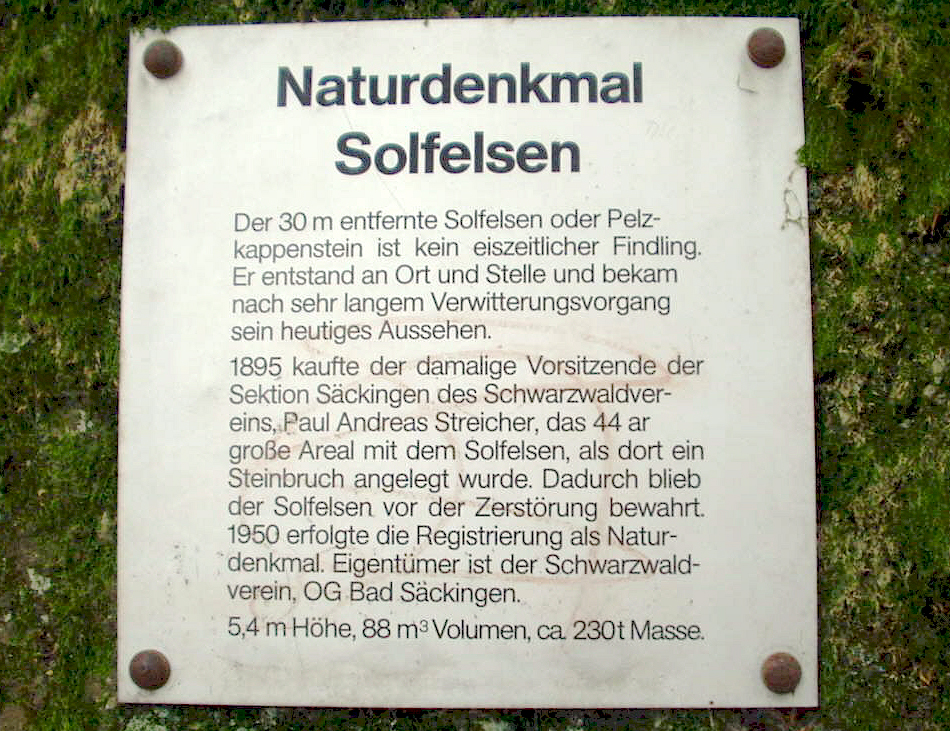 Der Solfelsen befindet sich in 775 Metern höhe nördlich von Bad Säckingen, nahe dem kleinen Hotzenwaldort Jungholz bei Rickenbach. Beim Solfelsen – manchmal auch Pelzkappenstein genannt - handelt es sich um ein seit 1950 registriertes Naturdenkmal. Der mit einer Höhe von 5.4 Metern und einer Masse von 230 Tonnen frei liegende Stein ist kein eiszeitlicher Findling, sondern entstand durch einen lange anhaltenden Verwitterungsvorgang. Der Granitblock ist durch Verwitterung nahezu rundlich verwittert, was ihn so einzigartig macht. Als im Jahr 1895 hier ein Steinbruch entstehen sollte, kaufte die Säckinger Ortsgruppe des Schwarzwaldverein das 44 rund Ar große Areal um das heutige Naturdenkmal, um es vor der Zerstörung zu retten. Das Gestein des Solfelsen besteht aus Albtal-Granit, in dem Einschlüsse von Gneis und Andalusit-Hornfels enthalten sind.