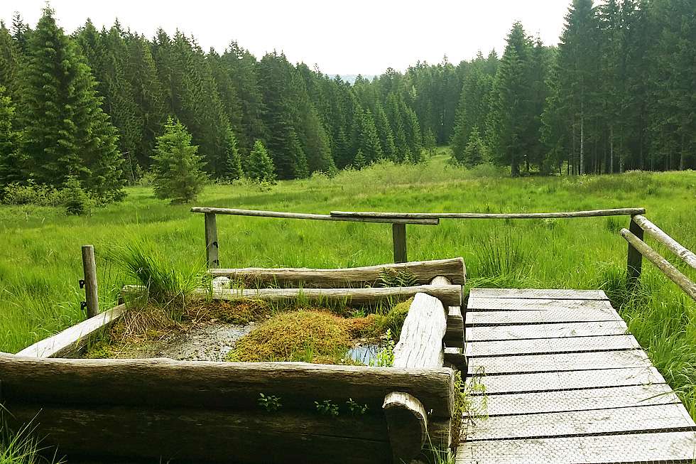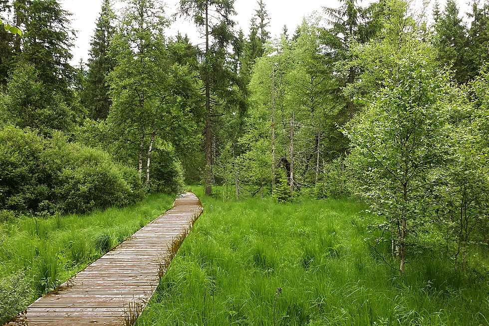 Der gut ausgebaute Wanderweg - teilweise auf schönen Holzstegen - führt in die herrliche Landschaft der ursprünglichen Hochmoore.